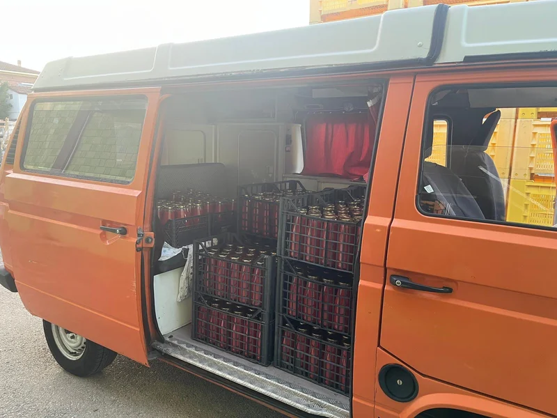 E, in pieno stile camillico, il ritiro dei vasi di pomodoro pronti è avvenuto in tre tappe, di cui una coperta da Fulmine (foto), il furgoncino arancione anni ‘70 del nostro socio Giuseppe!