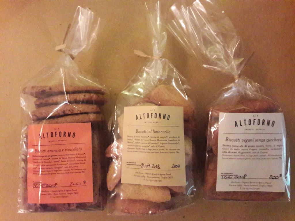 Biscotti non vegani: “arancia e cioccolato” (con farina di grano tenero Marzotto di Zocca, burro di Vacca Bianca modenese, uova, scorza di arancia, cioccolato fondente , sale di Cervia, “biscotti al limoncello” (farina di mais fioretto, farina di miglio, zucchero di canna, burro di Vacca Bianca, uova, scorza di limone, liquore al limoncello, cremor tartaro, sale di Cervia), “biscotti castagne e noci” (farina di castagne, fecola di patate, burro di vacca bianca modenese, noci, zucchero di canna, uova, miele, cremor tartaro, sale di Cervia).